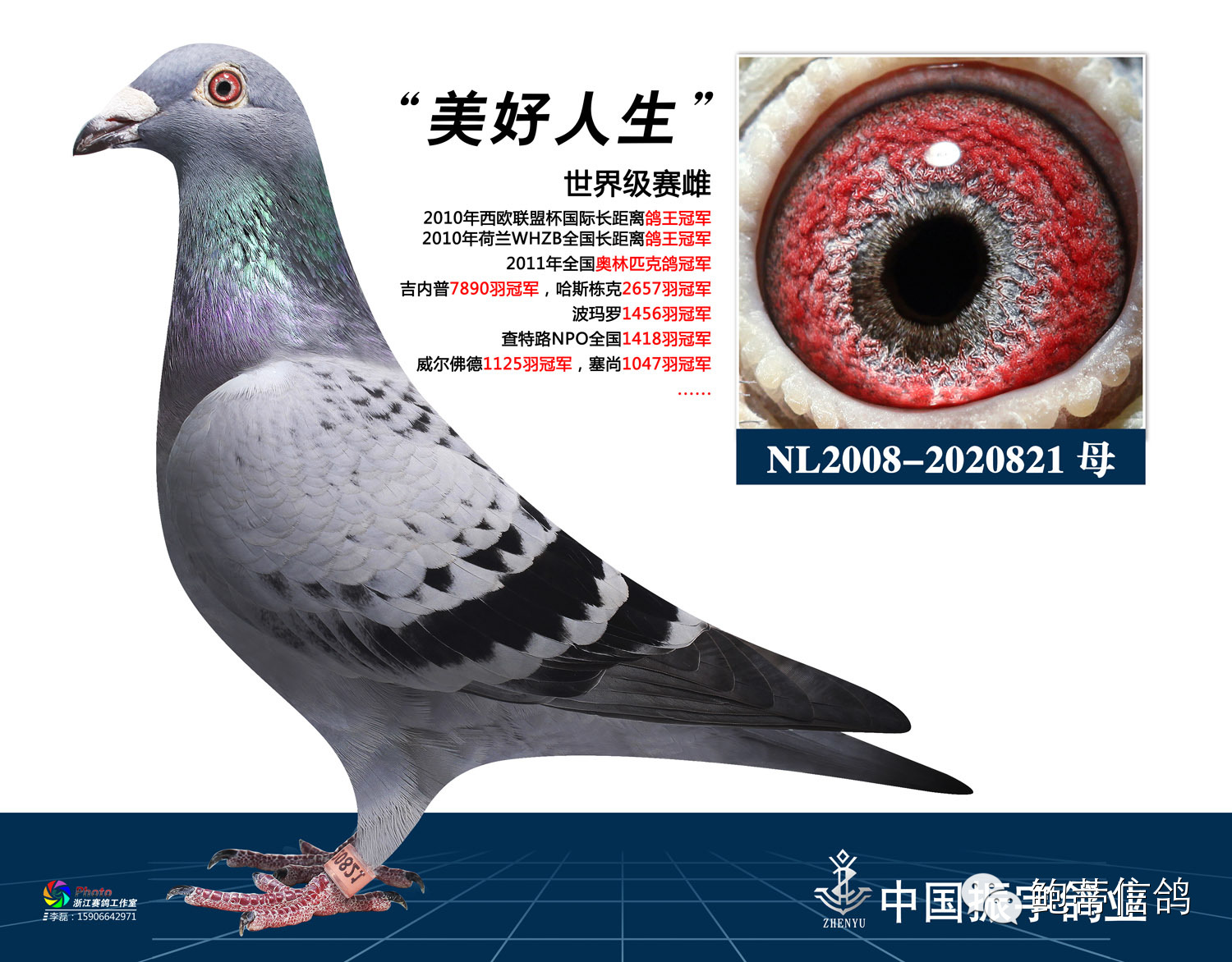 环号NL08-2020821,作出者:荷兰彼特·文斯特拉,母亲是优秀种母“特殊灰”,父亲是“达芬奇”。【美好人生】曾获2011年奥林匹克全能鸽王荷兰冠军、2010年西欧联盟杯国际长距离鸽王冠军、2010年荷兰WHZB全国长距离鸽王冠军等成绩。在2012年,温商胡振宇以25.04万欧元(折合人民币200多万元)拍下,创造了赛鸽拍卖史上的最高价格。uJw各地鸽舍---信鸽365--专业的中国信鸽信息网站